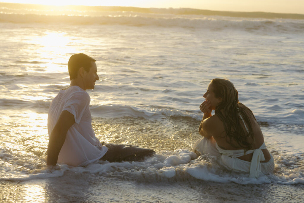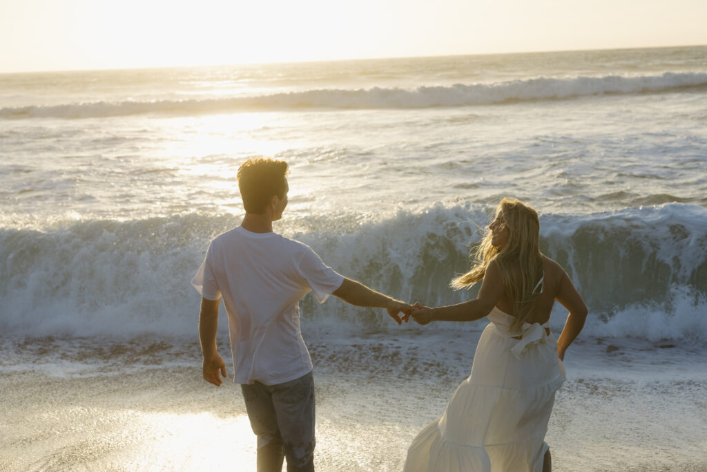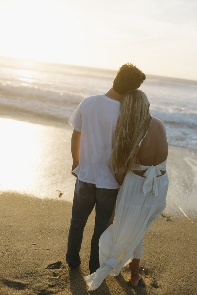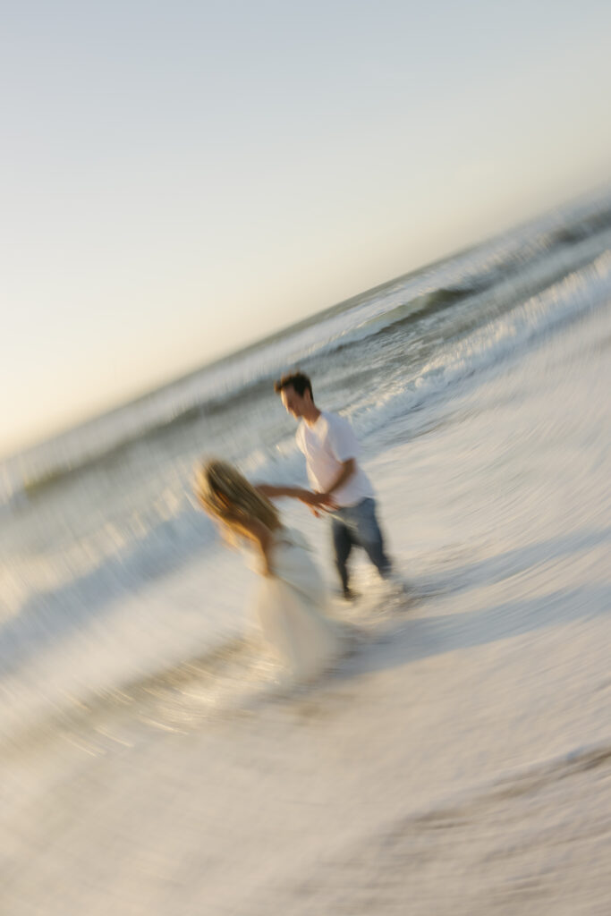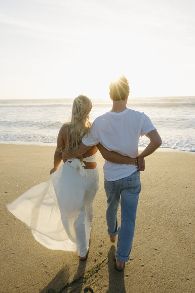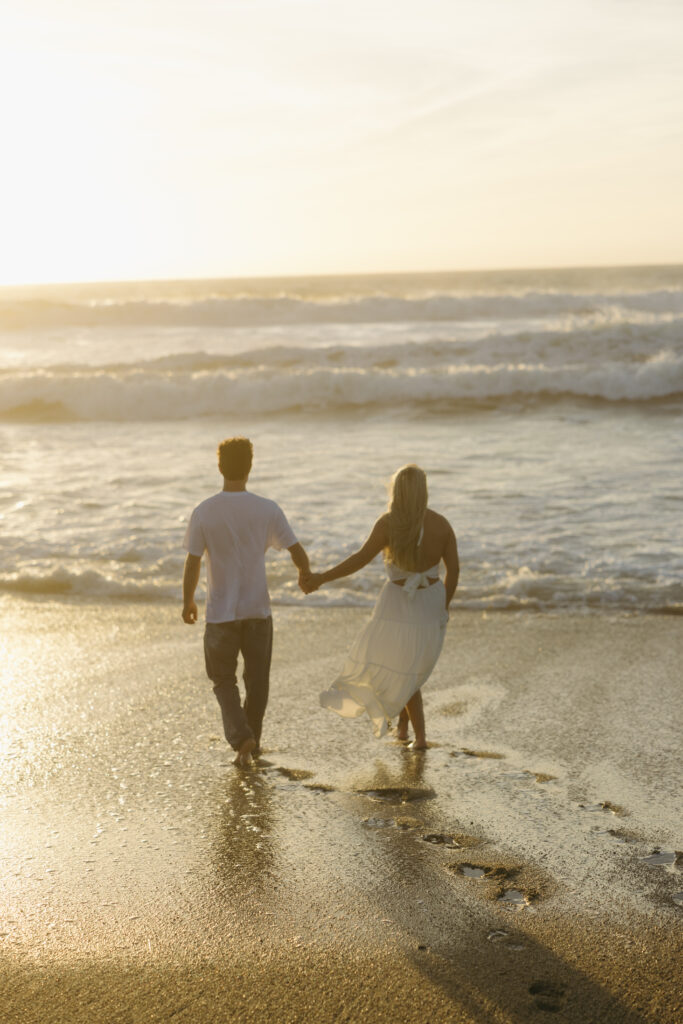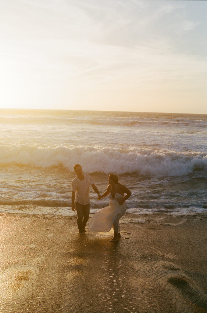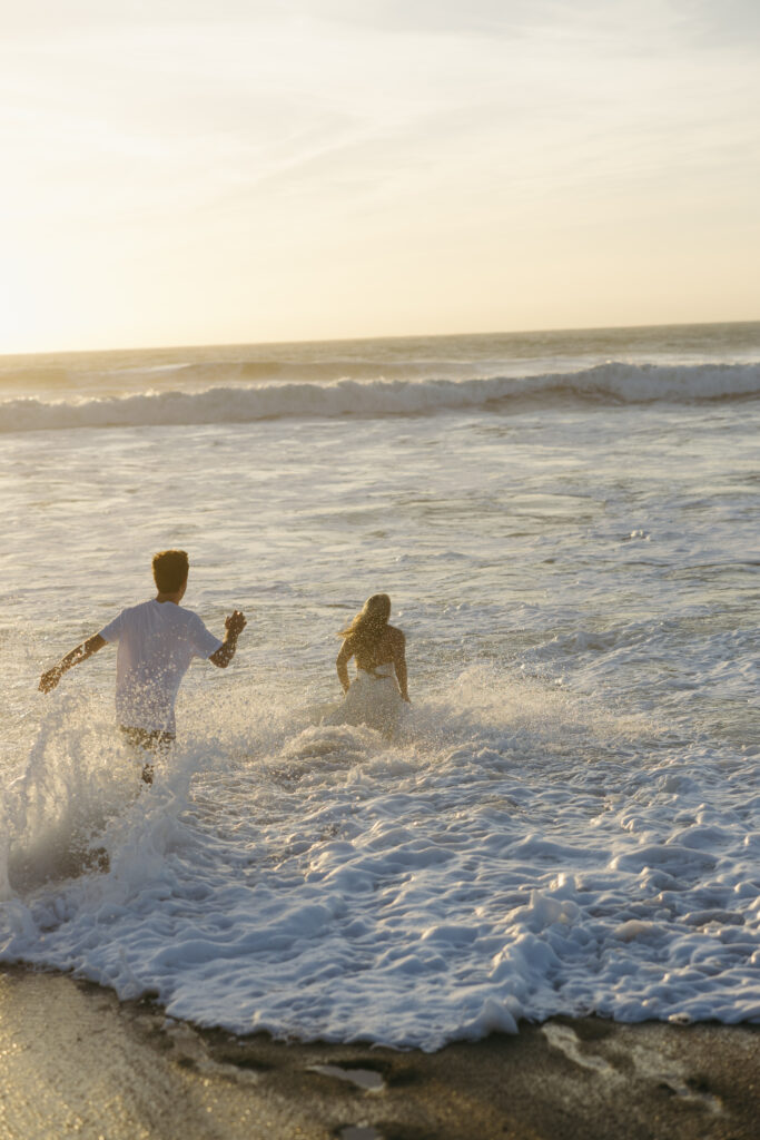Last but certainly not least, these two jumped fully into the ocean at sunset, clothes on, and with the biggest smiles on their faces. I couldn’t help but admire their bravery and dedication as they plunged into the freezing cold water, holding each other up, then falling back down into the waves. Over and over again they jumped in, then ran around the wet sand, having the absolute best time. The sun dropped low on the horizon, right above where they played in the waves, lighting them up from behind and casting the richest, orange-yellow light across the surface of the water and the sand. It was pure magic. Cinematic, dreamy, and so romantic.