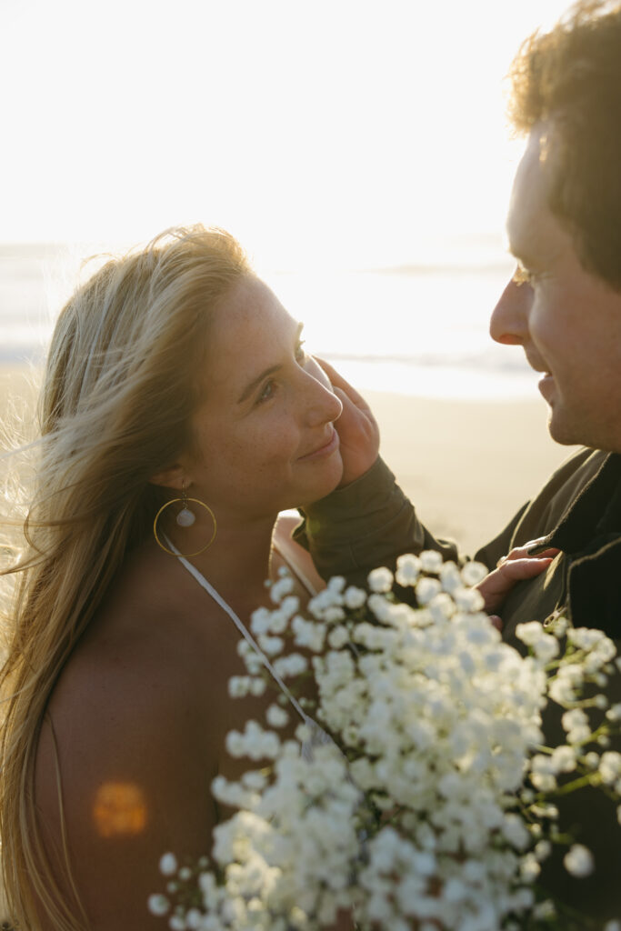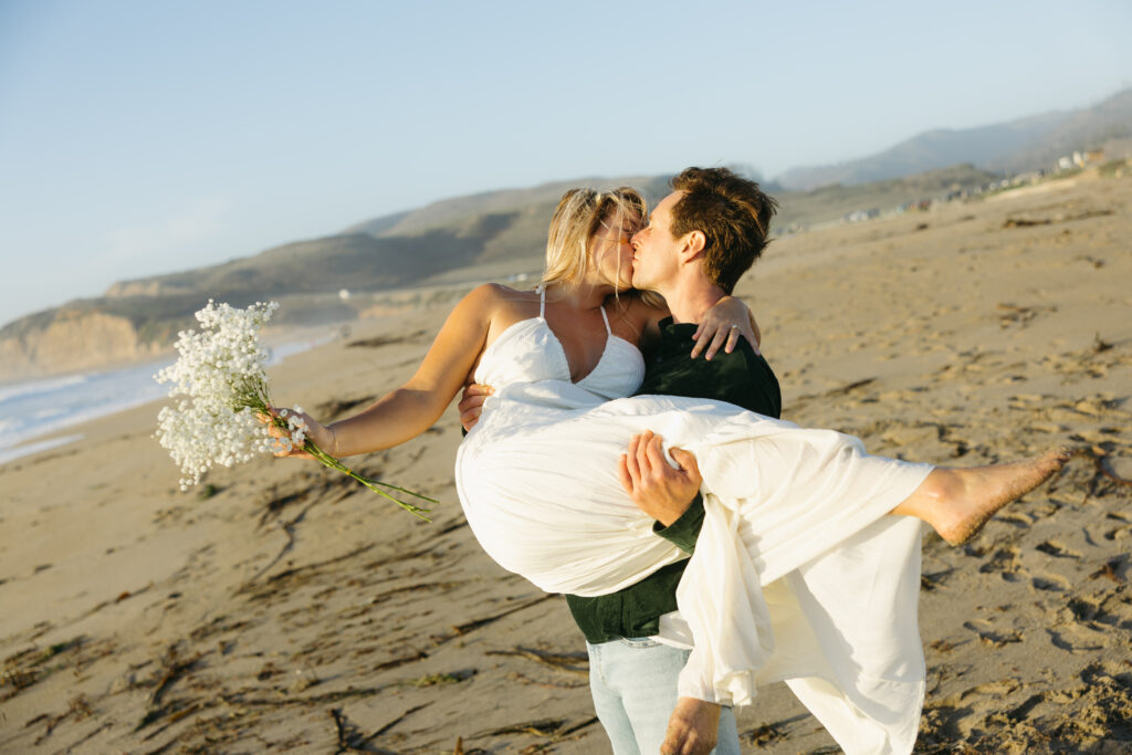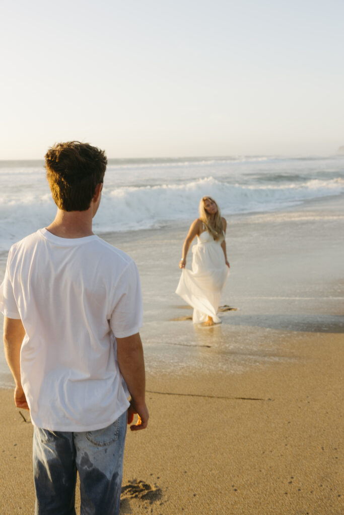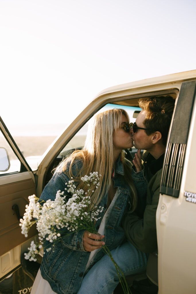 T & S’s engagement session was the perfect example of this half-day adventure. We spent the afternoon together frolicking through meadows, sand dunes, and the beach, celebrating their recent engagement. There is something so natural and beautiful about their love. Both surfers, creatives, and lovers of the outdoors, their energy was carefree and infectious. They were down for anything–climbing up sand dunes and fully jumping into the ocean in their clothes– and came prepared with props: their Toyota tacoma truck, a vintage polaroid camera, flowers, and a speaker so they could jam to their favorite tunes while we shot. I had never had so much fun being a third wheel.